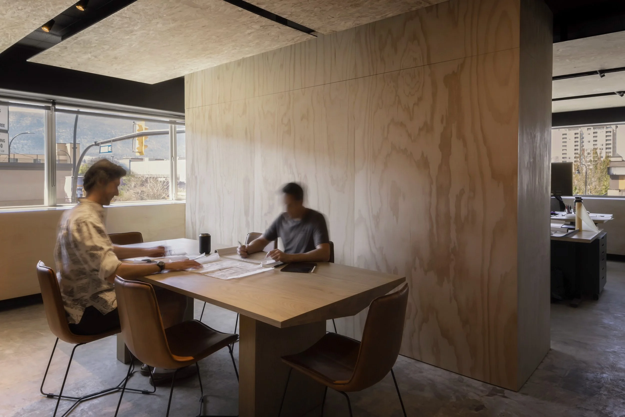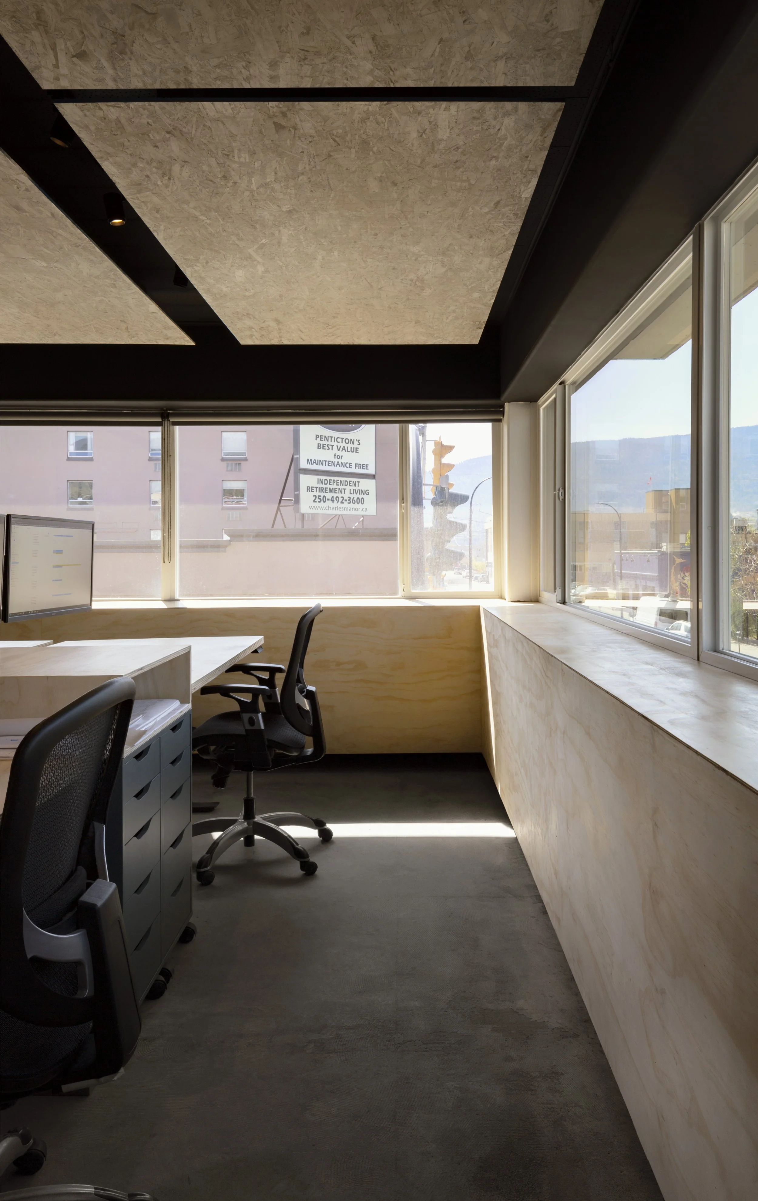 Previously a benign room of cheap acoustic ceiling panels and low-quality commercial carpet, the space was selected for its abundant windows and central location within Penticton’s downtown. The design hinged on removing everything that wasn’t essential, painting what was left a matte black to fade it into the background, and introducing new elements within the space that became the new focal points.